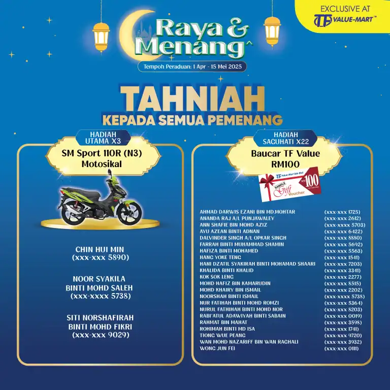 22 x Pemenang untuk Hadiah Saguhati: Baucar Tunai TF Value-Mart Bernilai RM100